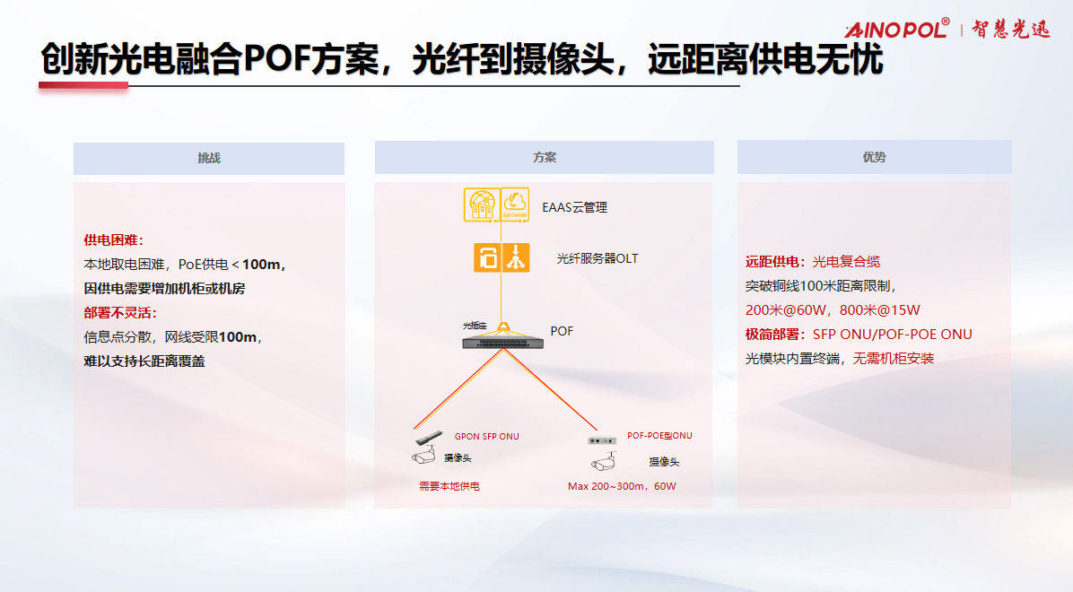 在传统的安防监控项目部署中,工程商往往面临两大“痛点”:一是PoE供电距离不足100米,二是信息点分散导致布线复杂。针对这一行业顽疾,智慧光迅推出了创新的光电融合POF方案,通过“光纤到摄像头”的技术革新,真正实现了远距离供电无忧与极简部署。