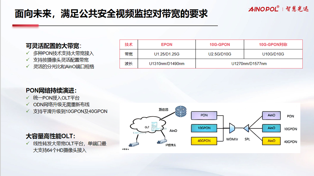 随着平安城市、智慧交通、无人值守站点等安防场景的快速扩张,视频监控点位呈现密集化、广覆盖、环境复杂化趋势,视频回传网络面临着长距离传输、高带宽压力、严酷环境适应性和运维成本等多重挑战。智慧光迅(ANOPOL)依托深厚的光通信技术积累,推出光电融合视频回传解决方案,以PON(无源光网络)技术为核心,重新定义安防监控回传网络——实现简架构、低TCO(总拥有成本)、可管维、全场景覆盖,为行业用户提供高性价比、高可靠的视频传输体验。
