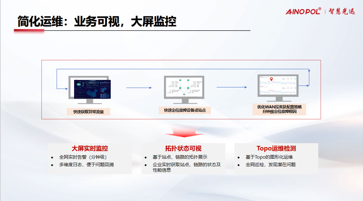 在智能化安防的新时代,网络是承载一切业务的基石。智慧光迅AINOPOL智慧光速解决方案,以分钟级故障定位、全拓扑可视化和极简运维为核心理念,助力企业实时获取站点及链路的精确状态,让安防网络运维从此变得简单、高效、智能。