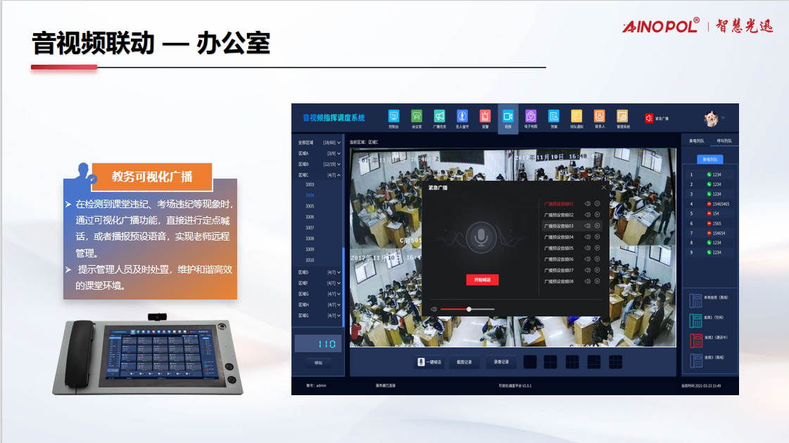 随着教育信息化不断深入,校园管理正朝着智能化、可视化、高效化的方向迈进。智慧光迅 推出的“音视频联动—办公室”解决方案,通过整合音视频指挥调度系统与教务可视化广播功能,为学校提供了一套完整、智能的远程管理工具,助力构建和谐、有序、高效的智慧校园环境。