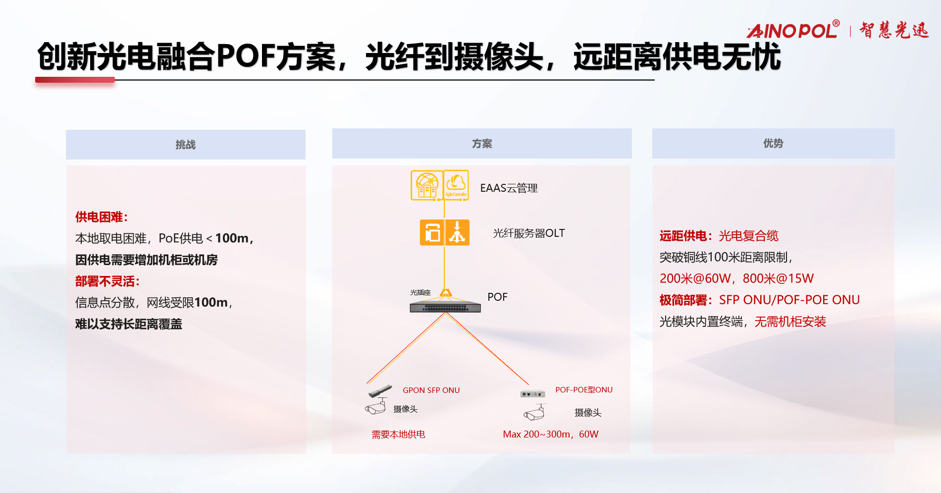 智慧光迅采用GPON + POF(光电复合缆) 系统架构,构建“光纤到摄像头”的全光监控网络: