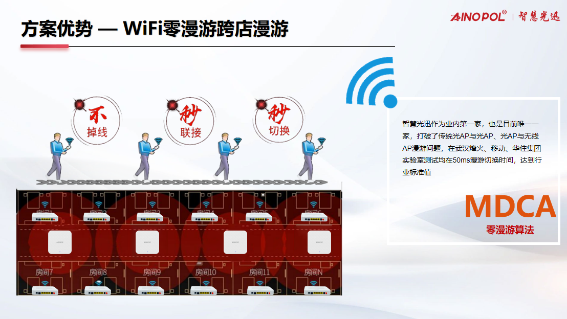 智慧光迅采用自研的MDCA零漫游算法,在武汉烽火、中国移动、华住集团等权威实验室实测中,漫游切换时间稳定控制在50ms以内,完全达到并超越行业标准。客人在场馆内移动时——无论是从大堂进入休息区,还是穿越多个功能区域,WiFi连接始终稳定如一,视频流畅不卡顿,语音通话清晰不间断。