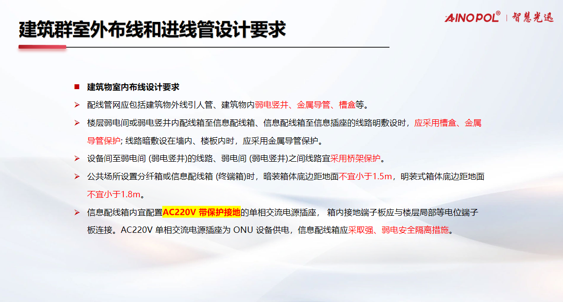 外线引入管理:建筑物外线引入管需符合防水、防潮、抗压标准,保护光纤在入户段不受外界环境影响。