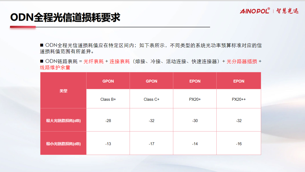 根据行业标准,不同PON系统对光链路损耗有明确且差异化的要求。目前主流的GPON标准中,Class B+ 类别要求最大光链路损耗不超过28 dB,最小不低于13 dB;而Class C+ 类别的性能要求更高,最大损耗值为32 dB,最小为17 dB。