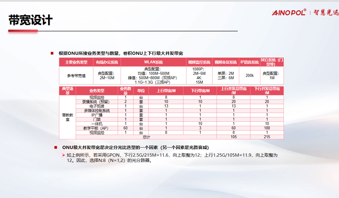 以某个智慧普教场景的实际测算为例,在汇总视频监控、录播系统、电子班牌、教学平板等所有终端业务的带宽后,我们得出其上行总并发带宽约为105M,下行总并发带宽约为215M。这一关键数据直接决定了无源光网络(PON)中分光比的选型。