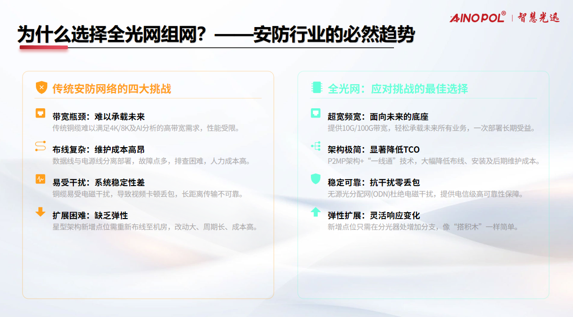 随着4K/8K超高清监控、AI智能分析在安防领域的普及,传统网络架构正面临严峻考验。智慧光迅(AINOPOL)推出的全光网解决方案,以光纤为传输媒介,彻底颠覆了传统铜缆组网模式,成为安防行业升级的必然趋势。