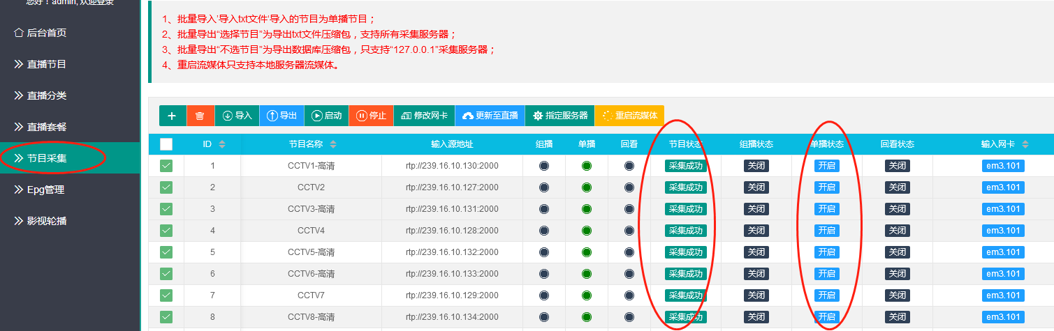 重点!!!!采集成功的节目,需要加到直播列表!!!全选!!!