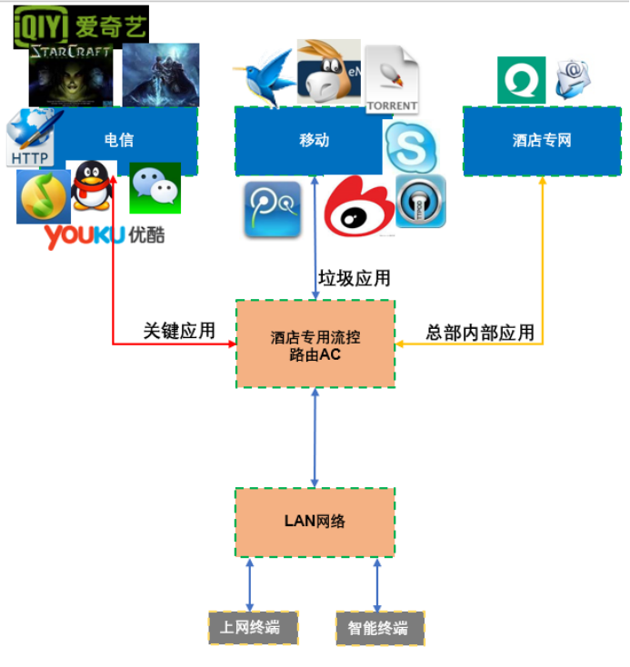 将不同终端出口进行分类,指定一条或多条外线为智能音箱、智能客控等设备的出口,客人上网和办公上网走另外的外线出口,当客房网出现拥塞流量不够是不影响智能设备的网络通信,从而提高酒店智能化系统的健壮性。如下图: