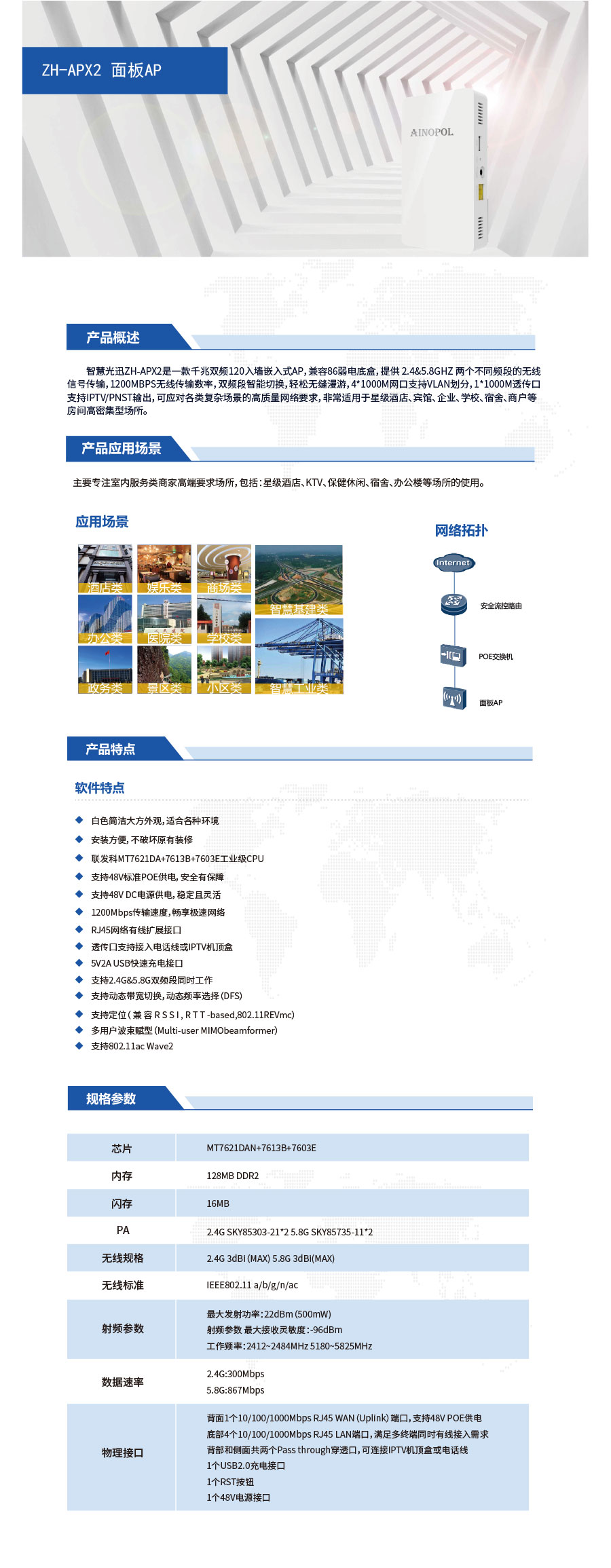 ZH-APX2提供1200MBPS超高速无线网络,可为房间密集型商家提供稳定快速的无线网络解决方案。 48V标准POE供 电或48VD C 电 源 供 电 供 用 户 灵 活 选 择 ;2.4GHZ&5.8GHZ双频并发,能接入更多的客户端,确保网络流畅稳定。 ZH-APX2适用于86型暗盒安装,可以直接替换墙上预留的86型网络接线面板,无需重新布线,不破坏原有装修,工程 安装与使用都十分简单方便,节省成本。
