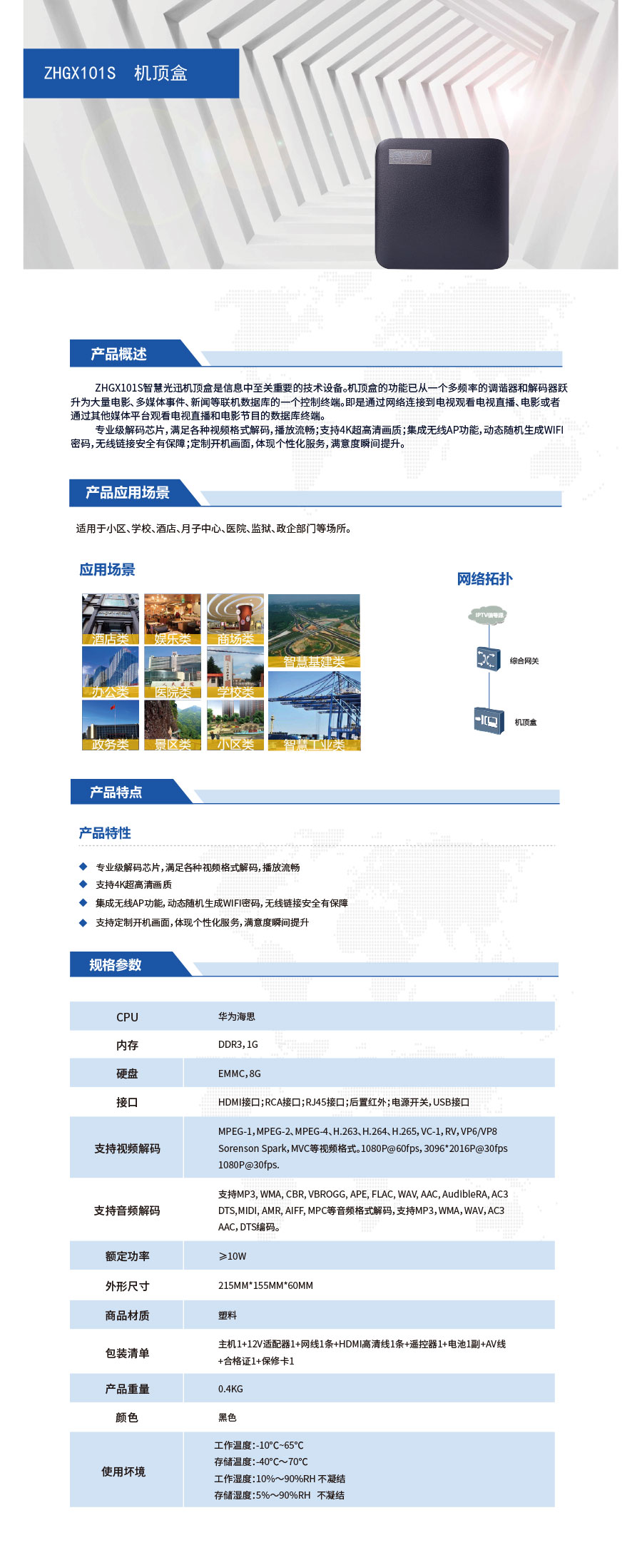 【硬件参数】4K带WIFI机顶盒【主要功能】支持4K超高清画CPU华为海思内存DDR31G存储EMMC8G存储【备注】机顶盒
