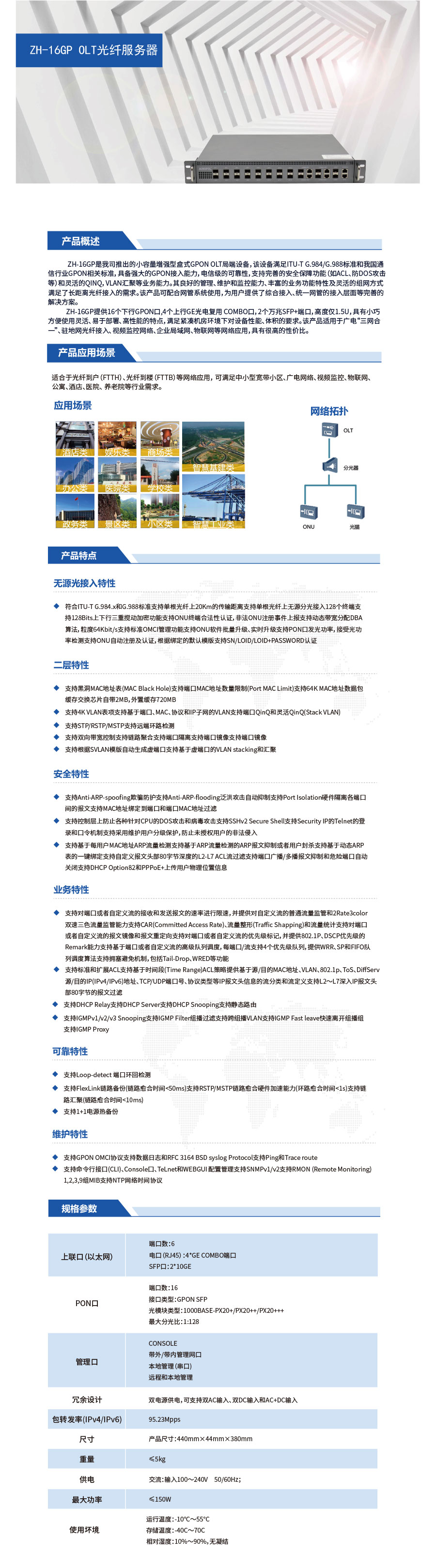 ZH-16G是我司推出的小容量增强型盒式GPON OLT局端设备,该设备满足ITU-T G.984/G.988标准和我国通信行业GPON相关标准,具备强大的GPON接入能力,电信级的可靠性,支持完善的安全保障功能(如ACL、防DoS攻击等)和灵活的QinQ,VLAN汇聚等业务能力。其良好的管理、维护和监控能力、丰富的业务功能特性及灵活的组网方式满足了长距离光纤接入的需求。该产品可配合网管系统使用
