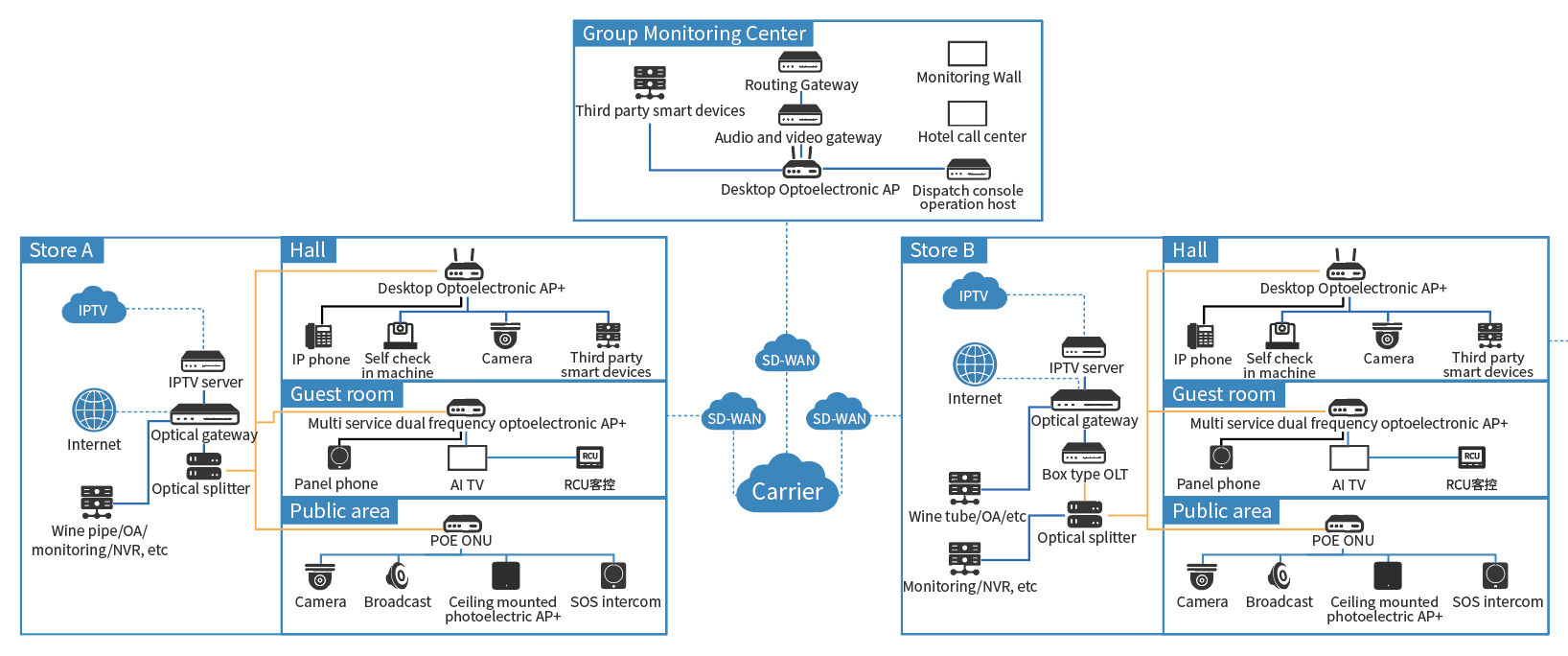 Plug and play automatic access to headquarters network, no need for on-site IT support, can also be remotely operated and maintained